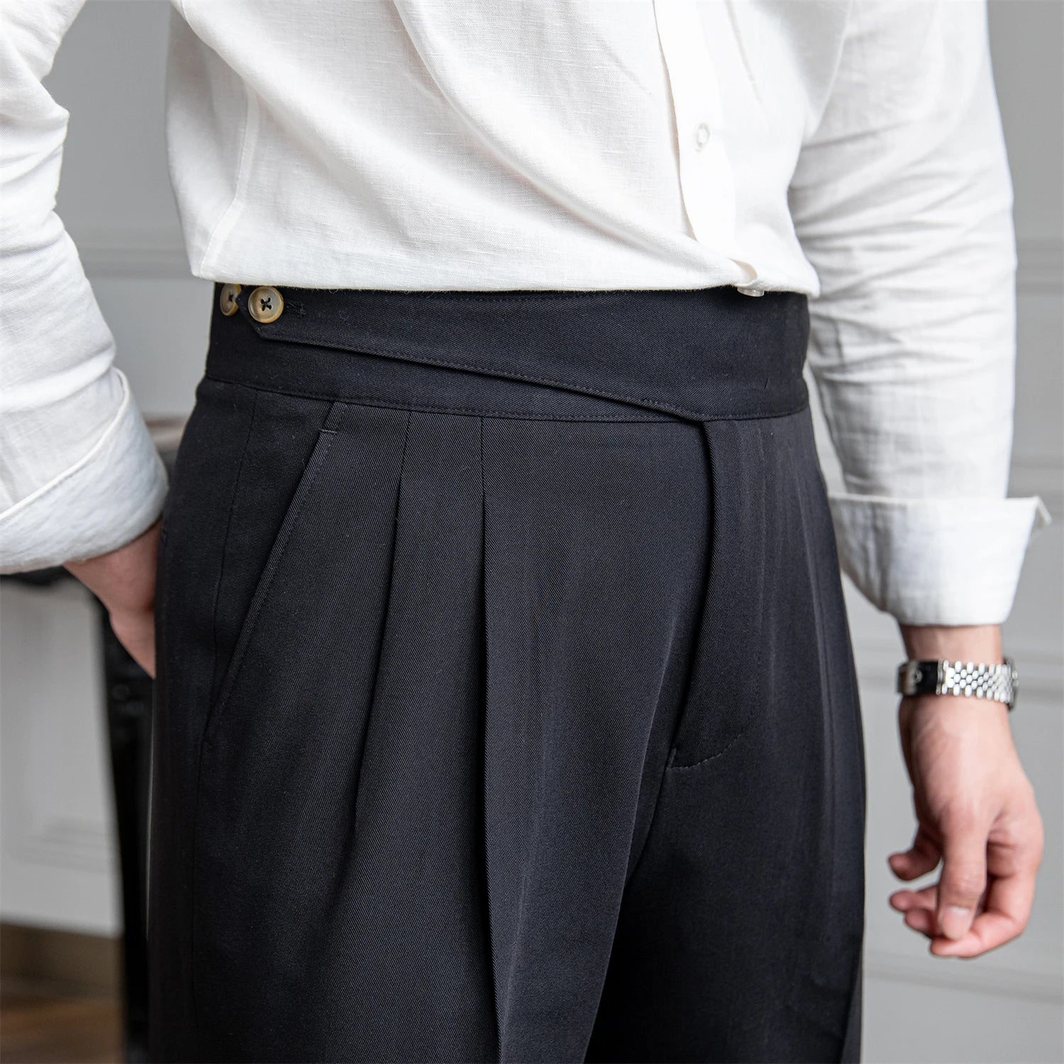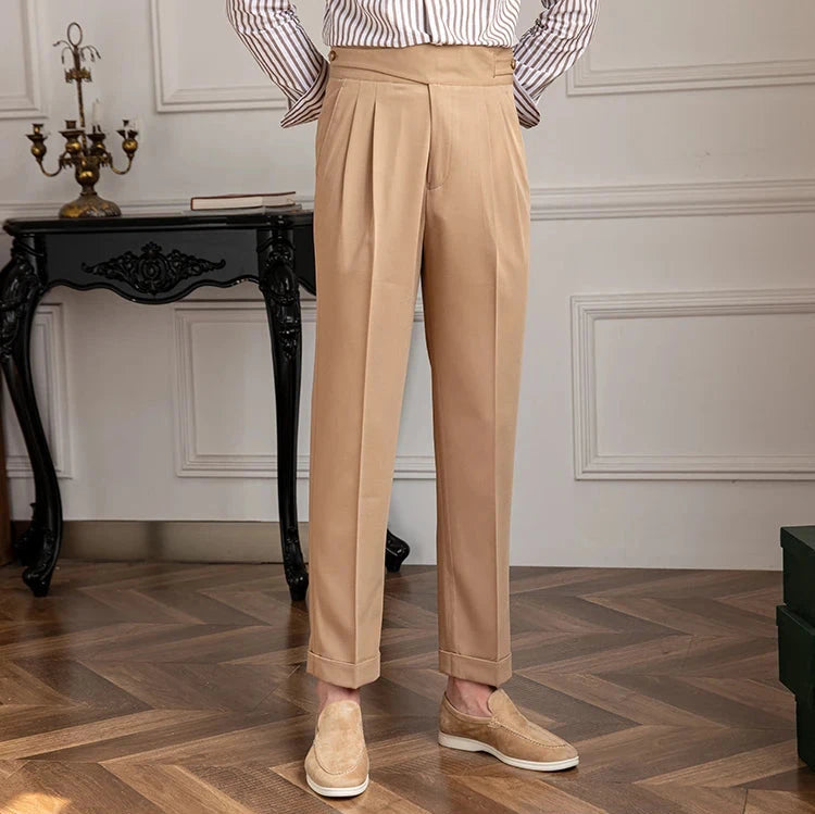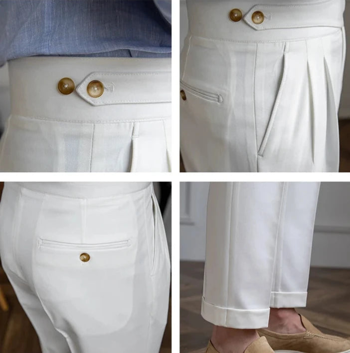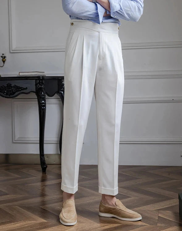 Le pantalon à plis Cimone allie une coupe impeccable à une fonctionnalité polyvalente. Doté de plis sur le devant et de boutons réglables, il offre une allure raffinée et un confort sur mesure, parfait pour une tenue habillée ou décontractée.